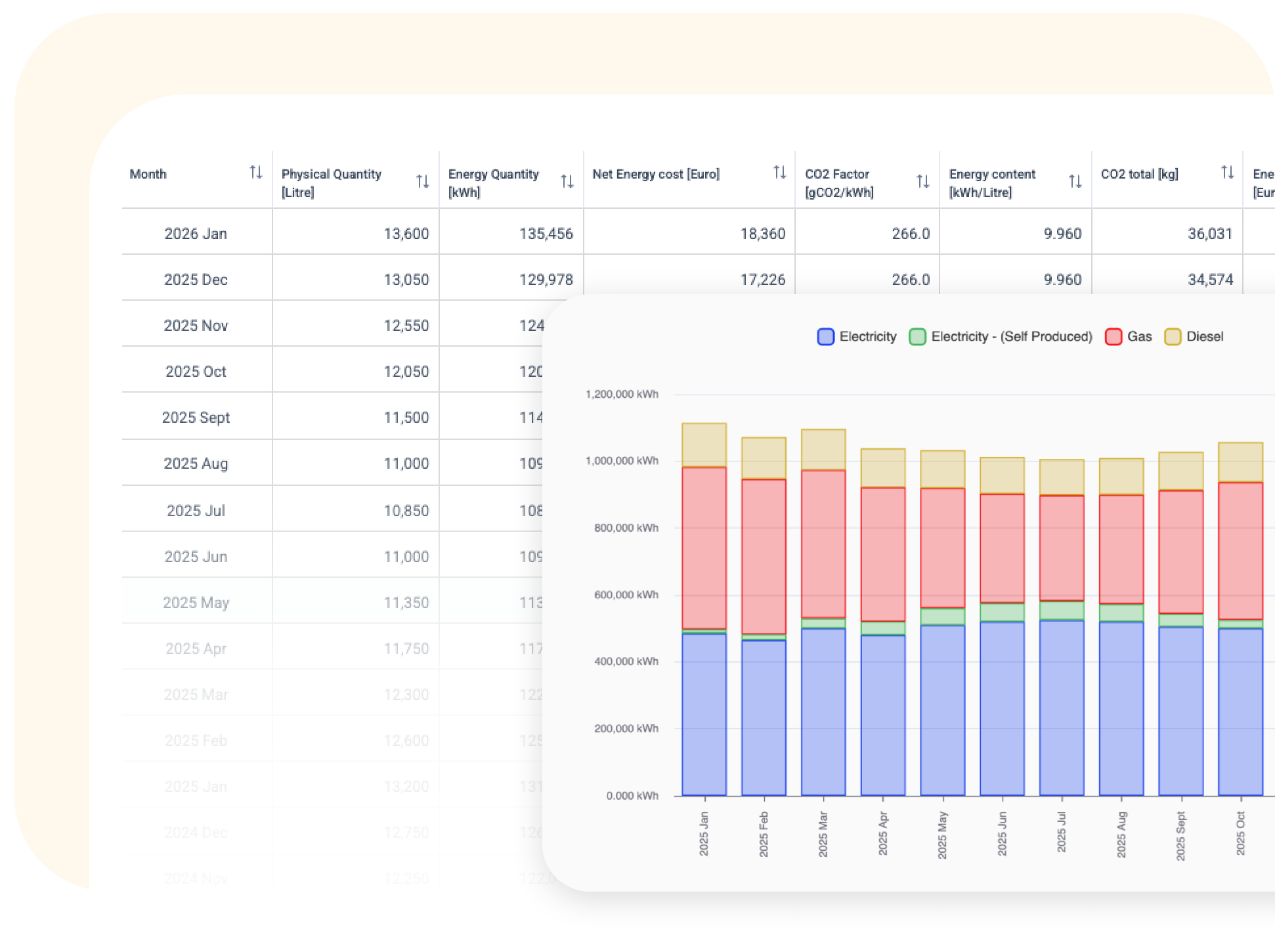 Keep track of all your energy bills in one place. See and study your organisation’s or each location’s yearly energy use. Get a clear picture of how much energy is used, how costs are changing, and how CO₂ affects the environment by energy source and over time.