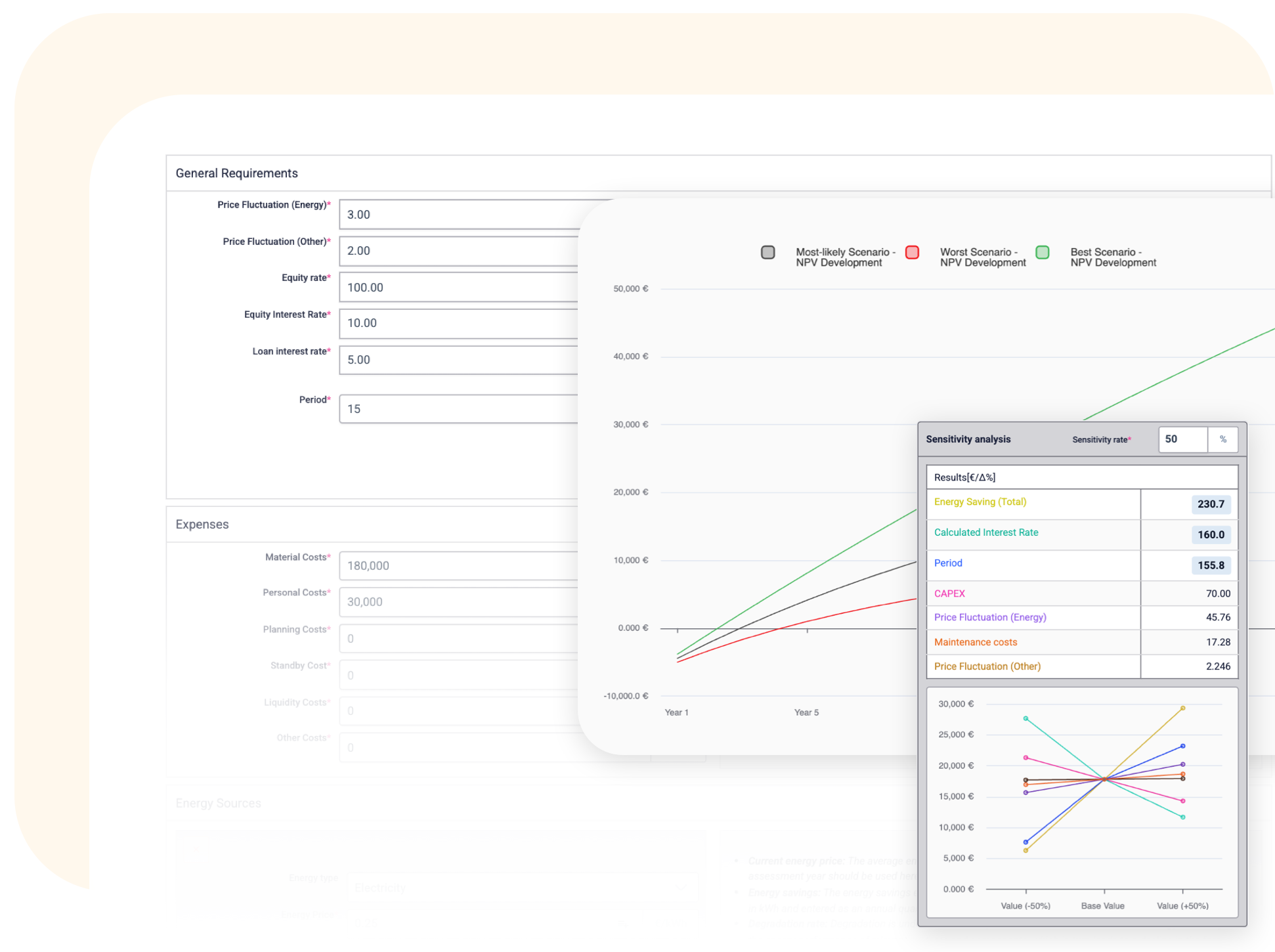 Plan and evaluate energy efficiency measures with confidence. The Viability Calculator helps you assess cost-effectiveness according to VALERI DIN EN 17463, ensures compliance, and supports funding applications. Run net present value calculations, test scenarios, analyse sensitivity, and make smarter, cost-effective decisions. Instantly generate professional reports to document results and share insights with stakeholders.